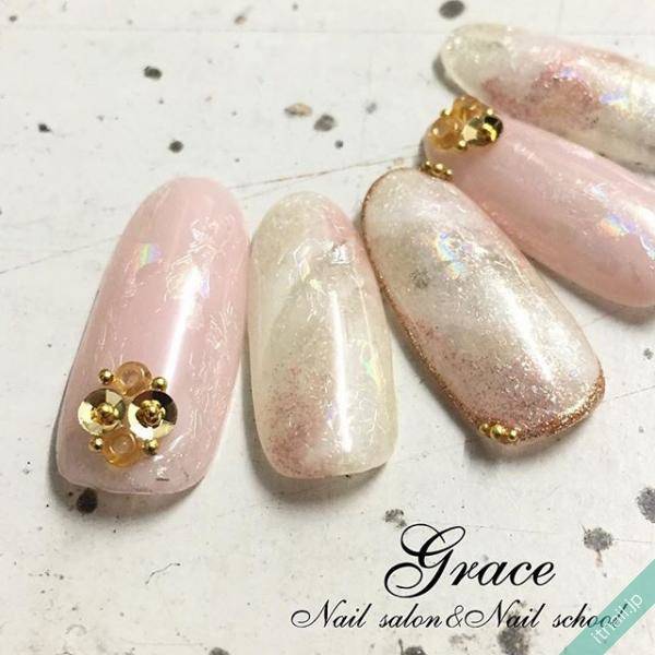 例えば、ピンクのワンカラーネイルの根元に、ビジューではなくスパンコールを盛ったデザインはいかがでしょうかか?ゴールド系のスパンコールを使えばゴージャスですよ。