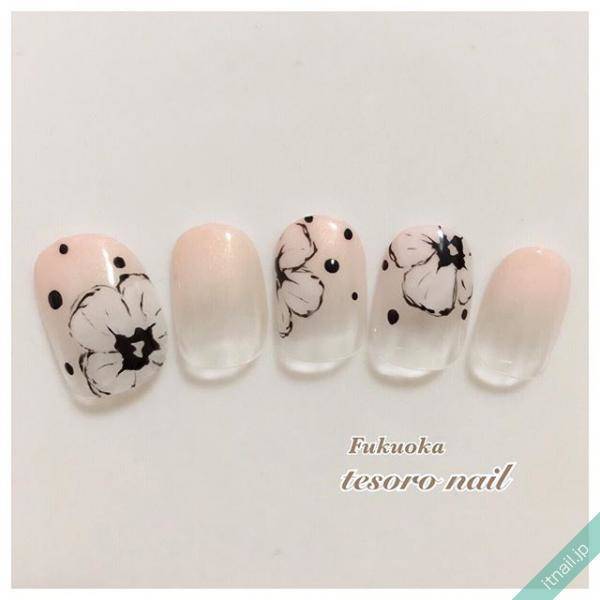 あまりキラキラしたデザインが好きではないなら、ベージュのグラデーションの上に、ブラックのみでフラワー柄とドット柄を描いてもいいでしょう。ドットの大きさを大小さまざまなものにすれば、デザインに変化が出ます。