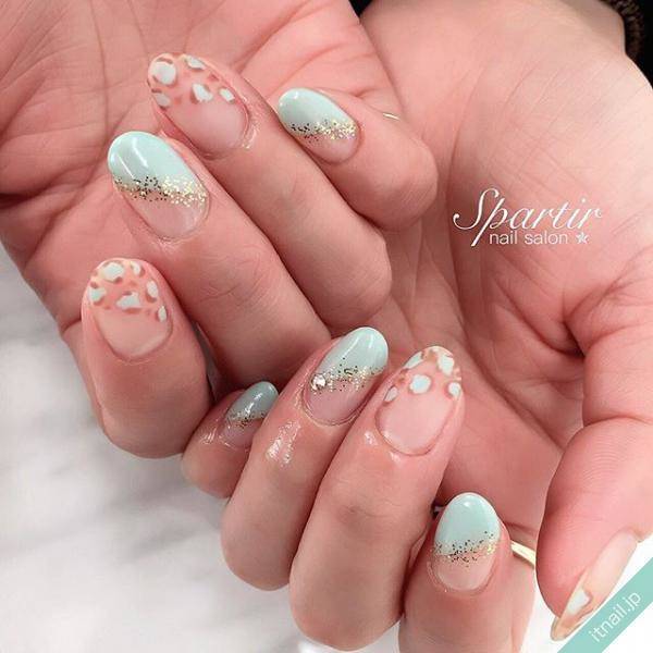 爪の先端にだけ、水色×ブラウンのレオパード柄を描いて、レオパードフレンチのようにアレンジするのも素敵なアイデアです。根元がクリアなので爽やかにきまります。ほかの爪は、水色の斜めフレンチにし、ゴールドのラメを散りばめましょう。
