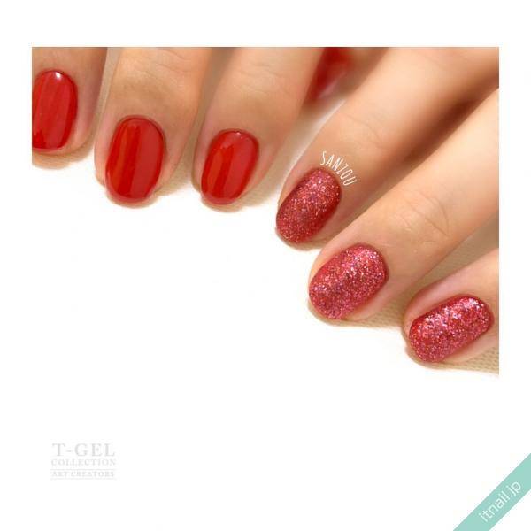 例えば、片方の爪を鮮やかレッドでカラーリング、もう一方の爪をレッド系カラーのラメ入りジェルでカラーリングするデザインはいかがでしょうか。キラキラネイルは、艶仕上げのネイルに使ったカラージェルにラメをたっぷりMIXしてアートしてもいいでしょう。