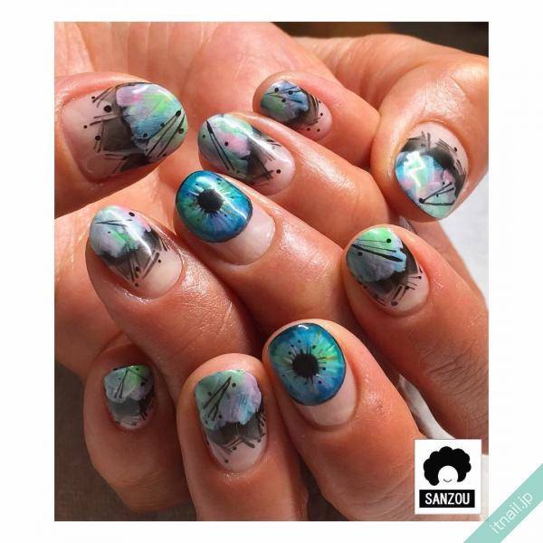 爪から視線を感じる...そんなホラーなネイルにしたいなら、リアルな目玉を描いてみるのはいかがですか?ブルーとグリーンが絶妙に混ざった目玉は、まるで本物のようです。美しく透き通った瞳が、余計に怖さを演出しますね。目玉以外の爪も、少し狂気を感じるニュアンスアートにして、ホラーらしさを表現しましょう。