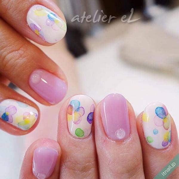 水彩画風アートの魅力のひとつは、何といってもゆめかわな雰囲気です。水彩ドットを使ったシャボン玉ネイルも例外ではありません。特に、ピンクと組み合わせると、とてもガーリーになります。