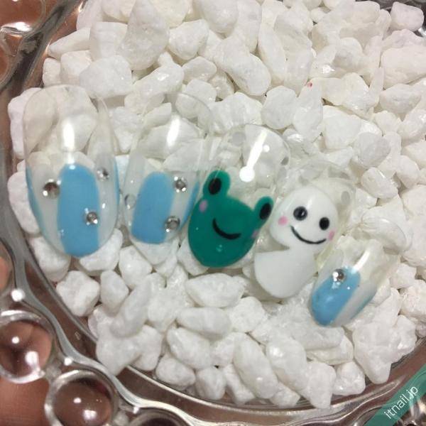 グリーンのカエルの顔をフレンチにしたネイルもポップです。ニコニコした表情のカエルに、癒やされますよね。カエルの隣には、笑顔のてるてる坊主もいて、見ているだけでほっこりとした気分になれそうです。