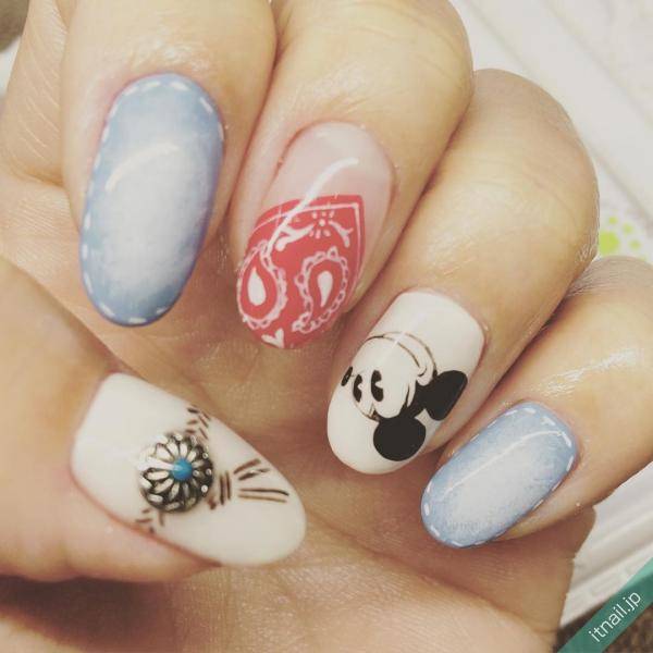 レッドのバンダナネイルは、キャラクターと組み合わせてもかわいいです。キャラクターは、ミッキーマウスはいかがでしょうか。ほかにも、デニムネイルやコンチョと組み合わせるとカジュアル感が出せます。オールドアメリカンスタイルを思い出させるデザインですね。
