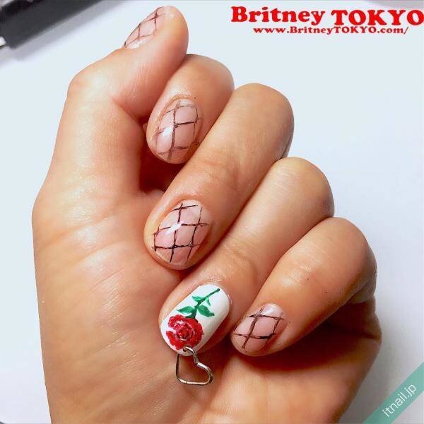 ホワイトのワンカラーの上に、レッドの薔薇を描きましょう。薔薇の花だけでなく、グリーンの茎と葉っぱを描くと、よりリアルになります。爪の先端にドリルで穴をあけ、ネイルピアスを取り付けましょう。ネイルピアスの形はさまざまですが、ここではハートのものを選びます。薔薇×ハートのネイルピアスが女の子らしくてかわいいですよ。ほかの爪は、クリアベースにブラックのチェック柄にします。個性が光るネイルですね。