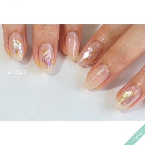 透け感のあるカラーにカットしたオーロラフィルムやシェルを埋め込めんで華やかさをプラス。奥行き感のある上品な輝きが大人女子から絶大な支持を集めています。服装や幅広いシーンに合わせやすいおすすめデザインをご紹介します。