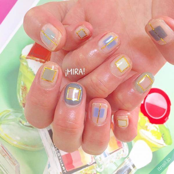 四角のアートと窓みたいなくり抜きアートをかけ合わせたオシャレデザイン。グレイッシュな配色も今っぽくて素敵ですよね。輪郭にはゴールドのラインテープを使ってフレームデザインに。四角アートがさらにエッジ―になり、ゴールドのエレガントな輝きが映えています。ショートネイルとの相性も◎。