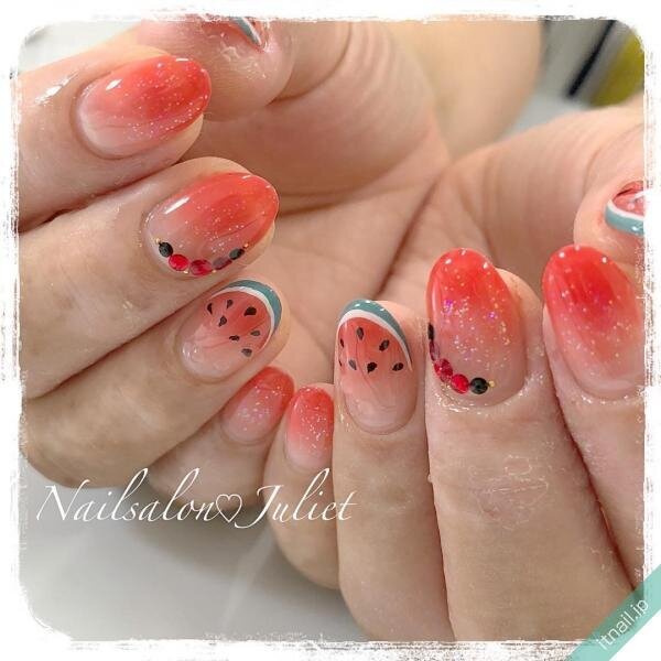 例えば、今年のトレンドであるシアーカラーをベースに、ちびスイカを1つアートするデザインはいかがでしょうか。ヨーヨーや花火、金魚、といった夏を思わせるモチーフをアートしたネイルと組み合わせるのもいいですよね。左右のデザインを全く違うものにする、アシンメトリーネイルに仕上げるのもお洒落ですよ!