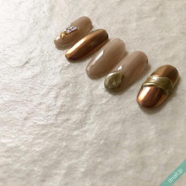 こちらはマロンカラーのグラデーションにたっぷりのゴールドを添えたエレガントなデザイン。アクセントのテラコッタも垢抜けたルックを叶えてくれます。