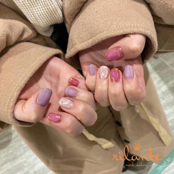 独特な色の入り方が美しいおはじきを忠実にに再現したいなら、ベースに多色を使うのがおすすめ。そこでこちらは同系色を組み合わせてベースカラーを作ったデザイン。ピンク系カラーを組み合わせ、そこにクリアをプラスすれば、キュートなおはじきネイルの完成です。