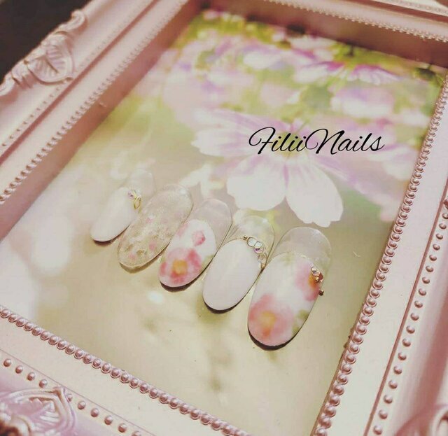 肌なじみの良いピンクベージュをベースに描かれたフラワーアート!
