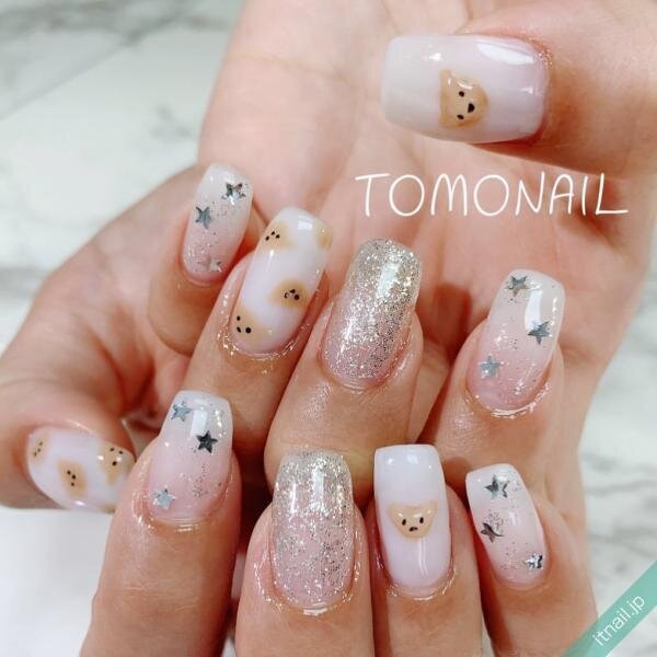 キラキラしたシルバーのホログラムと愛らしいベージュのくまでポップなデザインに。ぷっくりと立体的なくまと、柄っぽく描いたくまとでとにかくくま尽くしに仕上がっています。ポップで可愛い印象なので、爪はスクエアオフのかたちにして、やや大人っぽさも加えるといい塩梅です。