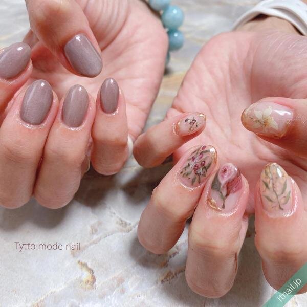 例えば、一方のネイルを、透け感のないこっくりとしたグレーでカラーリングし、もう一方のネイルを、透明感のある乳白色ベースにシェルを埋め込んだデザインにするネイルはいかがでしょうか。一方が透け感のない重厚感のあるネイルでも、もう一方を透明感のあるデザインにすることで、全体的に重すぎない、お洒落ネイルに仕上げられます。