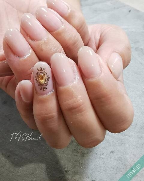 人気のニュアンスネイルもゴールドのパーツを使うことで、エレガントで華やかな指先になります。