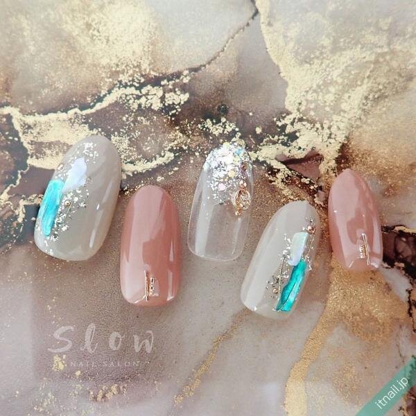 シンプルなデザインながら、ラメやメタリック、パーツを使って、色調は揃えながら、質感で遊んだ、新感覚のデザイン。控えめカラーなので、大人の女性にもトライしやすいデザインです。
