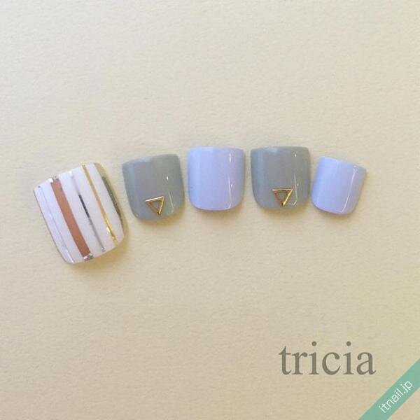 ラインテープのストライプデザインにアイスブルーとグレーが上品にまとめてくれるフットネイルです。