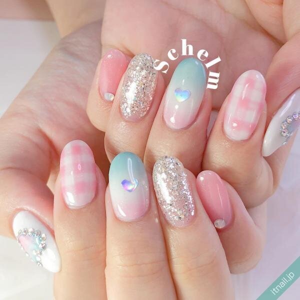 いちごみるくみたいなピンクのギンガムチェックにさわやかなブルのグラデーションが相性ばっちりです。ラメやストーンでキラキラ要素をトッピングするのもお忘れなく♩