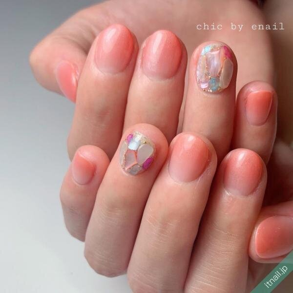 爪先に向かって色が濃くなる定番のグラデーションネイル。そのままでも十分可愛いですが、周りと差をつけたいなら、大粒のクラッシュシェルを爪いっぱいに敷き詰めて遊び心を加えてみましょう。きらっと輝いていいアクセントになってくれますよ。全体の色味とシェルでしっかり存在感が出せるので、ショートネイル派さんにもおすすめです。