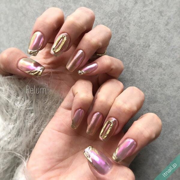 全面にピンクオーロラを纏い、メタリックのミラーで更にボリュームのあるネイルに。同じミラーパウダーを組み合わせることでより立体感が出て、相性抜群です。