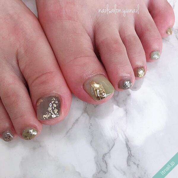 くすみグリーンのシアーネイルに、エレガントなゴールドのデコレーションネイル。ハンドネイルに比べて自由がききやすいフットネイルだからこそ、スタイリッシュに楽しみたいですよね。