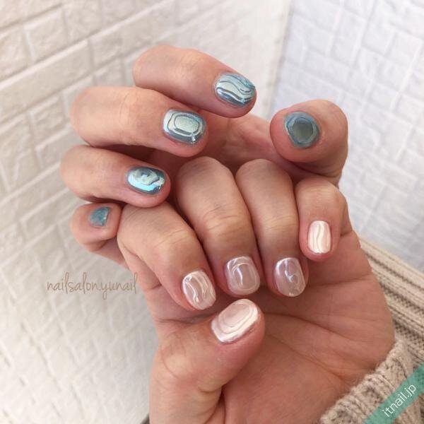 左手はツヤたっぷりのパキッとしたブルーで単色塗りに。右手は天然石風のデザインやメタリックなど、爪ごとにデザインを変えたデザインに。高発色な単色塗りだけ、デザインネイルだけだと力を入れすぎな印象にみえますが、2つを組み合わせればほどよいテンションに。あえてのちぐはぐ感がおしゃれです。