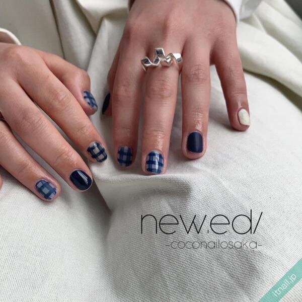ショートネイルにガーリーなギンガムチェックのデザイン。ネイビーの落ち着いた雰囲気で大人かわいい印象に仕上がっています。深みネイビーの一色塗りも、短い爪によく似合っていますよね。春夏にピッタリなオシャレネイルです。