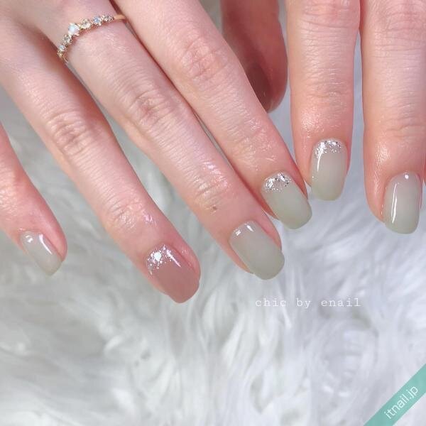 爪先と爪の生え際、それぞれに淡い発色を施した技ありのグラデーションネイル。さらにはクリアな立体デコレーションを添えて、クリスタルな輝きを放つネイルデザインです。甘さのないグレーだからこそ、こなれ感が際立ってスタイリッシュ。