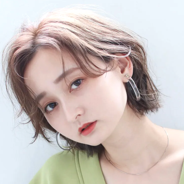 人気の切りっぱなしボブは、明るめのミルクティベージュを取り入れて変化をつけて。
