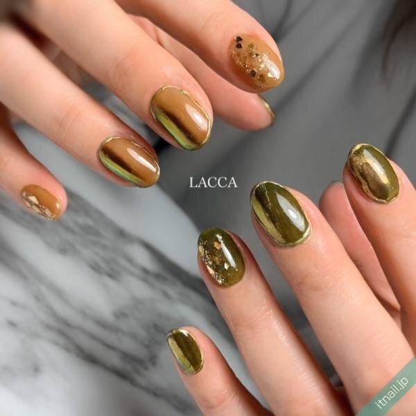深みのあるグリーンとベージュで作ったカメムシカラーは、ハンサムな大人ネイルを楽しみたい方にぴったりです。偏光ミラーのグラデーションがこなれ感もアップしてくれるでしょう♪
