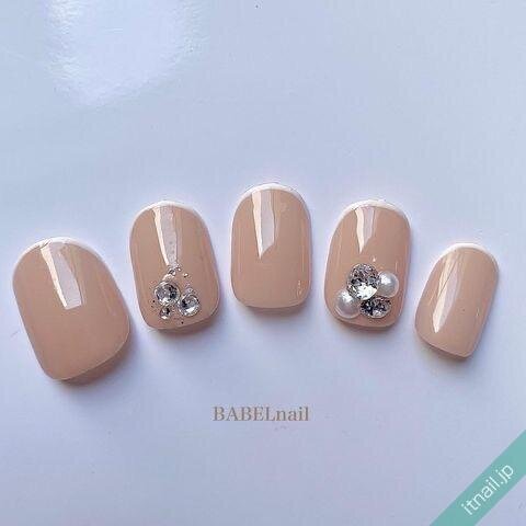 大人っぽいピンクベージュを基調としたネイルには、サイズ違いのパールを使って贅沢なモチーフを。たっぷり盛る分、派手になりすぎないよう1か所だけに留めて、特別感を出します。