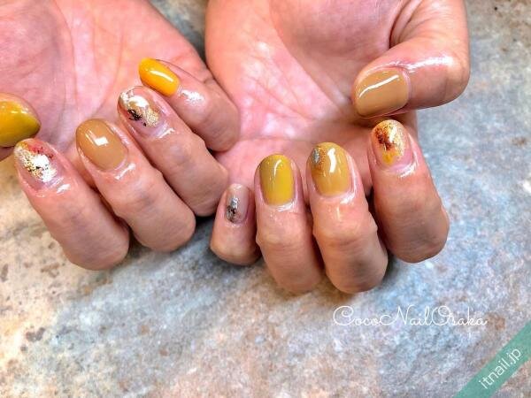 濃いめのブラウンとマスタードイエローは、塗りかけネイルにして抜け感を出してあげるとおしゃれです。クリアカラーをベースに、爪の中央や先端に色を入れてみてください♪
