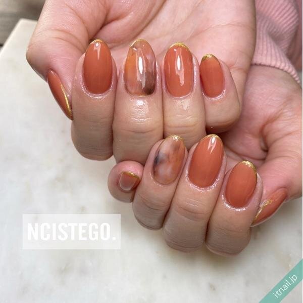 テラコッタカラーと相性の良いブラウンとホワイトのニュアンスネイルをポイントでプラスしたデザインです。