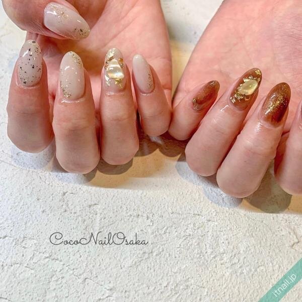こちらは、左右で異なるデザインを取り入れつつ、一ヶ所にべっ甲柄を入れたデザインです。ベーシックカラーでまとめているので、意外とすっきりまとめることができます。べっ甲ネイルに相性のいい金箔を散らせば、エレガントさがアップしますよ。