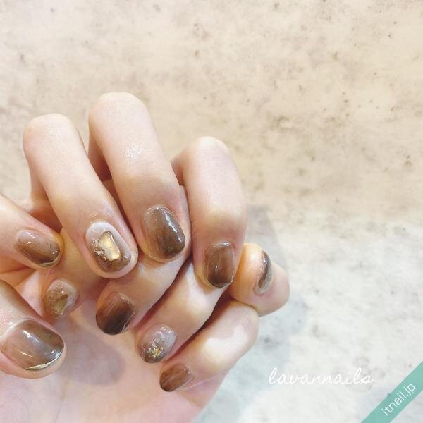 指先に向かって濃いめになるようにデザインされた、ブラウンカラーのもやもやネイルです。