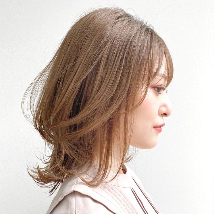 トップにボリュームを持たせてふわっとさせた、ゆるふわなミディアムヘアスタイルです。