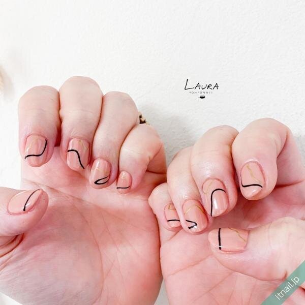 手肌の色になじむベージュをベースに塗って、ラインアートでアクセントをつけます。ショートネイルで清潔感を保ちつつ、ゴールドとブラックのラインで大人っぽい雰囲気を作りましょう。
