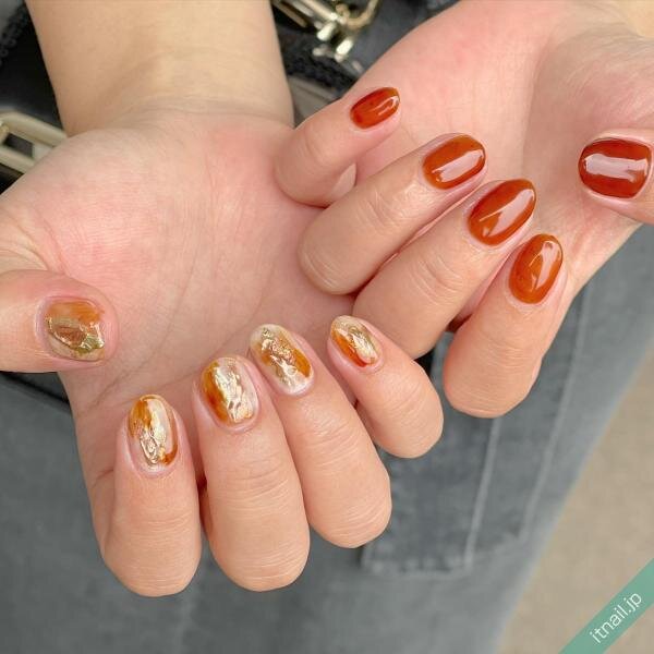 この季節に一度はやっておきたいテラコッタカラー。欲張ってアシンメトリーで取り入れてみましょう。シアーなテラコッタカラーでちゅるんとした質感を楽しみつつ、反対の手は塗りかけネイルでモダンスタイル。同系色でのアシンメトリーは統一感もあり、まとまった印象に仕上がります。