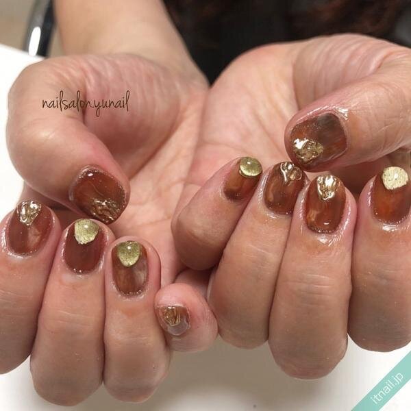 べっ甲のようなツヤのあるブラウンをベースにしたデザイン。爪先にはマグネットやメタリックなど今っぽいゴールドをちょこんと乗せて、最旬のデザインを狙っていきます♡ベースの色に深みがあるほどゴールドの色味がよく映えますよ!