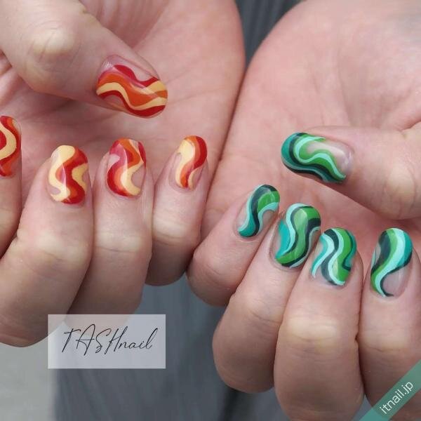 ラインを、多色使いで徐々にグラデーションになるように施した、インパクトのあるデザインです。色の変化を楽しめる個性的なネイルです。さらにアシンメトリーにすることで、周りの視線を集める派手目なネイルに仕上がります。