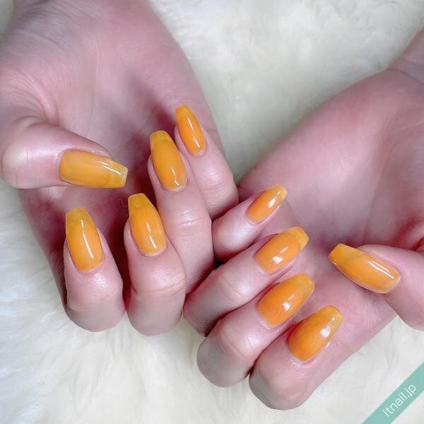 透け感のあるビビッドなオレンジカラーがジューシーな雰囲気を演出してくれます。透け感のあるビビッドカラーは、元気な印象とトレンドを両方取り入れることができます。