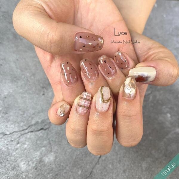 落ち着いたベージュネイルの上から、ラフに配置したフレークネイルがこちら。アニマル柄のようなルックスがユニークで大人かわいい印象です。立体的なゴールドのミラーアートで装飾して、ハイセンスな指先を目指しましょう。