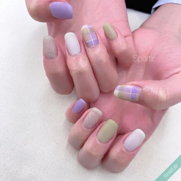 くすみカラーを使ったポップなチェックネイル。ポップなテイストに抵抗がある方も、マットコーティング仕上げならカラーも落ち着いて見えるのでチャレンジしやすいです。