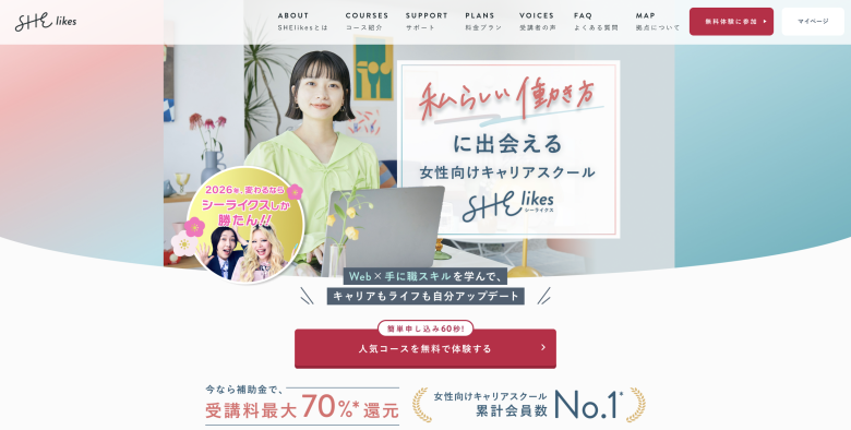 「SHElikes(シーライクス)」は、Webデザインをはじめ、マーケティングやライティング、コーディングなど、50以上の職種スキルを学べる女性向けキャリアスクールです。Webデザインコースでは、デザインの基礎から実践的な制作スキルまでを動画で学べるため、初心者でも無理なく取り組めます。無料体験レッスンに参加すれば、講座の一部を無料で受講でき、学習内容やスクールの雰囲気を事前に確認できるのも安心です。
