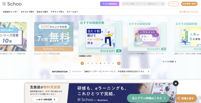 「Schoo(スクー)」は、ビジネススキルからデザイン、プログラミングまで、幅広い分野を学べるオンライン学習サービスです。Webデザイン関連の講座も充実しており、基礎知識や考え方を身につけたい初心者に役立ちます。業界の第一線で活躍する講師が登壇し、実務を意識した内容を学べる点も魅力です。