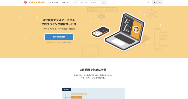 「ドットインストール」は、1本3分以内の短い動画で学べる初心者向けのプログラミング学習サービスです。Webデザインに必要なHTML・CSSやJavaScriptをはじめ、Web制作に役立つ講座が豊富に揃っています。動画形式のため、テキスト学習が苦手な人でも取り組みやすいのが特徴です。