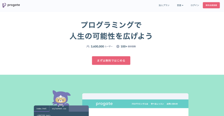 「Progate(プロゲート)」は、プログラミング初心者向けのオンライン学習サービスです。HTMLやCSS、JavaScriptなど、Webデザインに必要なプログラミングの基礎を、スライド形式でわかりやすく学べます。入門コースは無料で利用でき、パソコンとインターネット環境さえあればいつでも気軽に始められる点が魅力です。