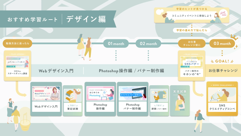 Webデザインを独学で学ぼうとすると、「何から手をつければいいかわからない」「一人で学習を続けられるか不安」と感じる人も多いでしょう。そんな方におすすめなのが、学習の道筋があらかじめ整えられているSHElikesです。