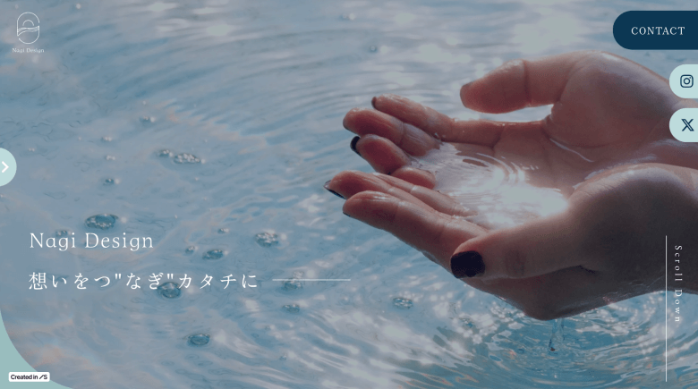KOTOさんのポートフォリオは、「Nagidesign(ナギデザイン)」という屋号に合わせ、穏やかで透明感のあるデザインが特徴的です。Webサイト、紙媒体、バナー/FV制作、その他の制作の4つのカテゴリーと担当範囲が整然とまとめられており、クライアントが完成形をイメージしやすい設計になっています。