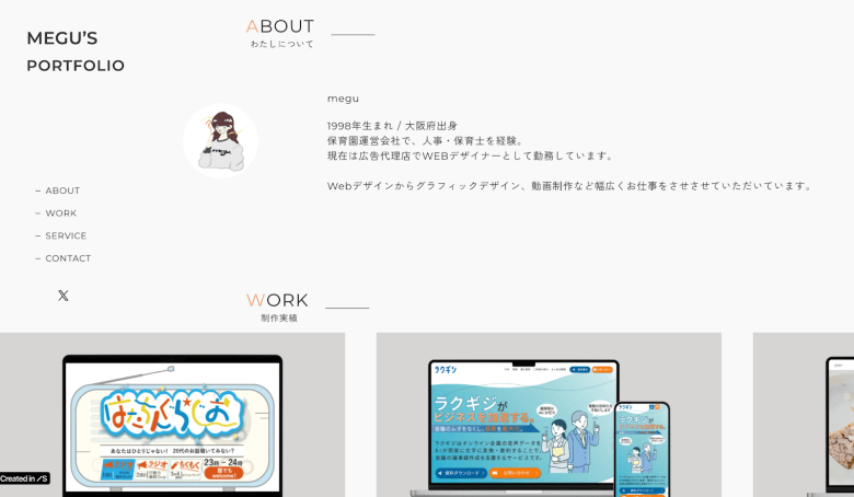 meguさんのポートフォリオは、サイトを開いた瞬間に目に飛び込んでくる「デザインで、もっとワクワクを。」というキャッチコピーが印象的です。自身の制作実績を横スクロールにすることで、「どんなデザインが得意か」が一目で伝わります。シンプルでありつつ洗練されたポートフォリオを作成したい方は参考にしてみてください。