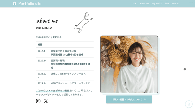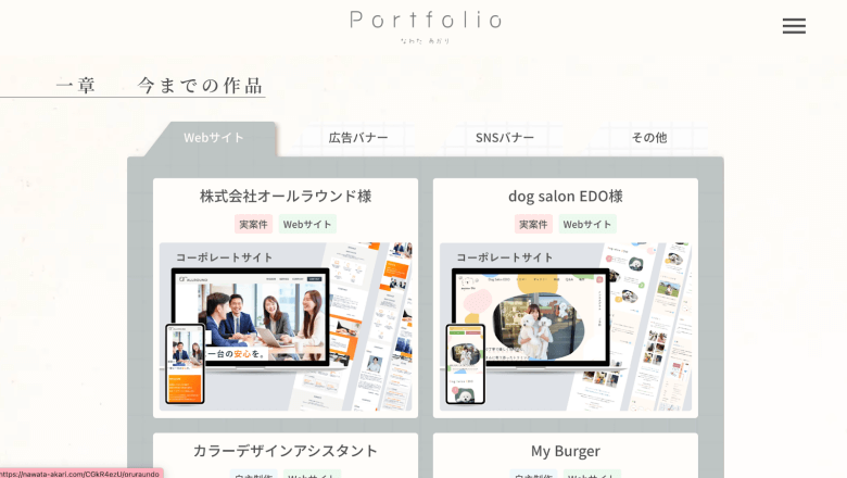 あかりさんのポートフォリオは、余白を活かしたモダンなレイアウトが特徴です。情報の優先順位が整理されているため、初めて訪れた人でも迷わず作品を閲覧できます。未経験からスタートしたとは思えない、完成度の高いポートフォリオです。